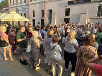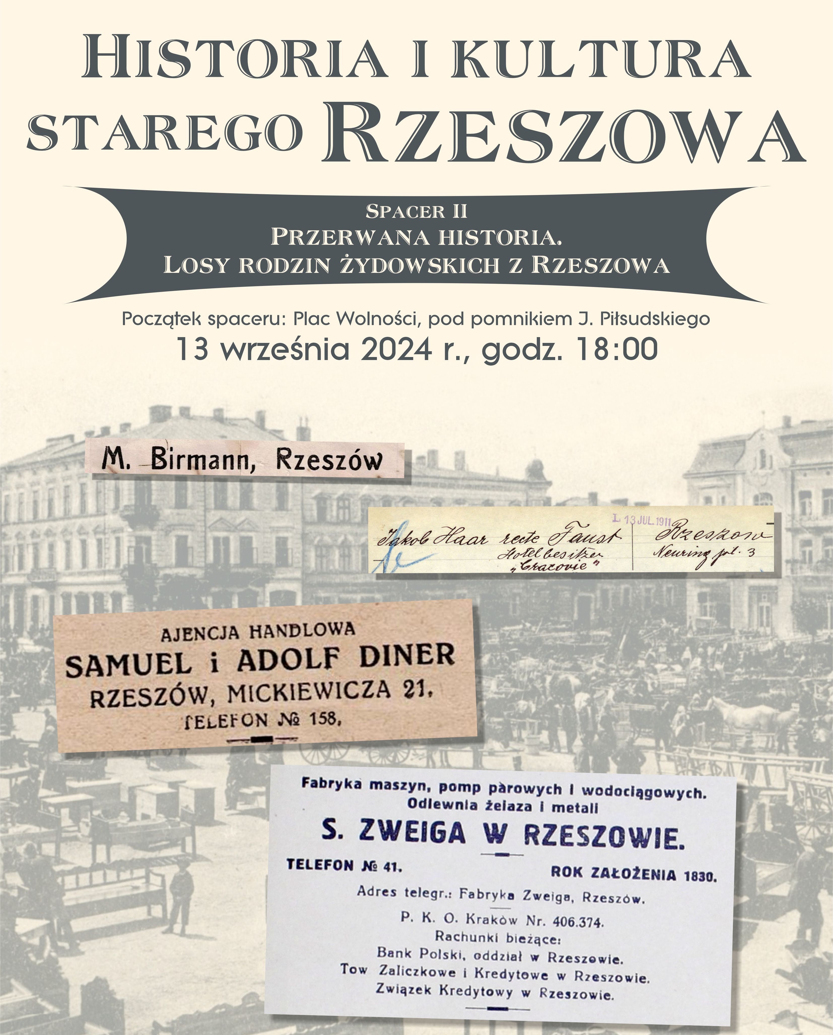 23 sierpnia 2024 r. odbył się spacer „Żydowskie sklepy I lokale usługowe z okresu okupacji”. Trasa rozpoczynała się pod pomnikiem Józefa Piłsudskiego na Placu Wolności. Miejsce to, do wybuchu drugiej wojny światowej, było Rynkiem Nowego Miasta. To tutaj kwitł handel, tutaj spotykali się kupcy i handlarze z Rzeszowa i okolic. Następnie poznaliśmy miejsce, w którym niegdyś istniał salon fryzjerski Markusa Goldmana, później poznaliśmy lokalizacje sklepu z towarami mieszanymi Klingera, czy z towarami bławatnymi Sary Tannenbaum. Następnie, szlak spaceru wiódł przez Rynek, gdzie między innymi zobaczyliśmy zachowane do dzisiaj drzwi prowadzące niegdyś do sklepu Pffeffera. Przez ul. Kościuszki dotarliśmy do ul. Grunwaldzkiej, gdzie spacer zakończył się pod dawną witryną zakładu fryzjerskiego Eisiga Adera.  Szlak naszego przejścia wytyczały zdjęcia dawnych witryn sklepowych z okresu okupacji, które znajdują się w zbiorach Galerii Fotografii  Miasta Rzeszowa. Spacer patronatem objęła fundacja Forum Dialogu.